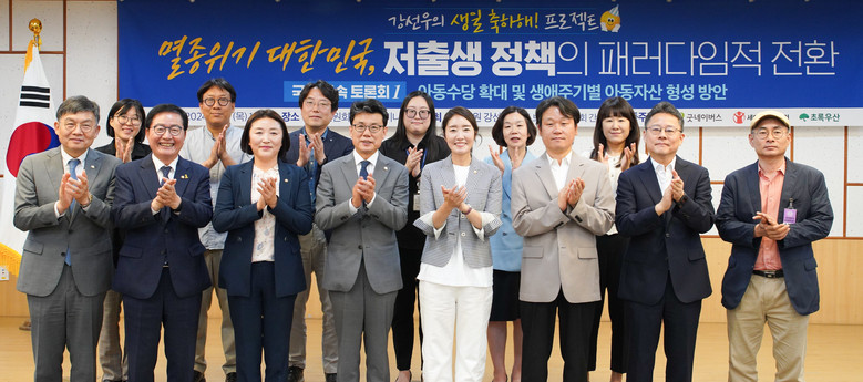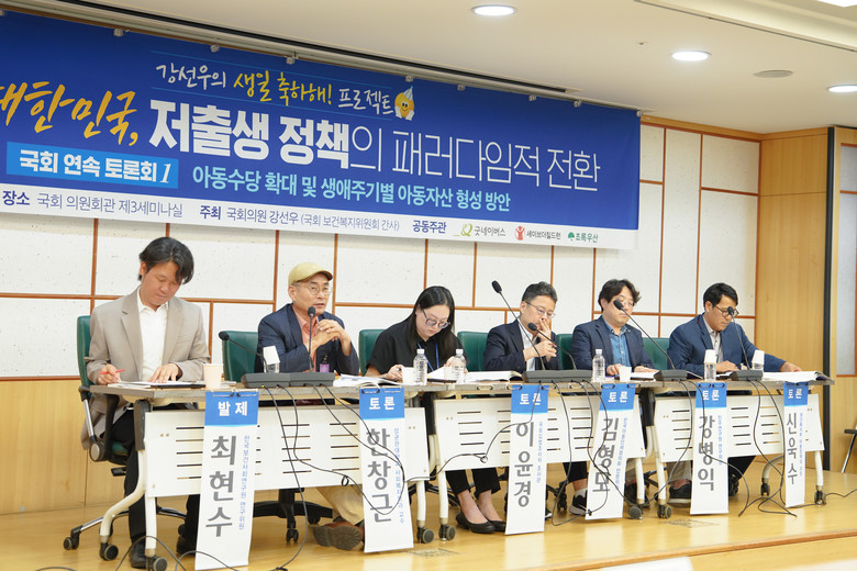 13 일 ( 목 ), 강선우 더불어민주당 의원 ( 서울 강서갑 , 보건복지위원회 간사 ) 은 < 멸종위기 대한민국 , 저출생 정책의 패러다임적 전환 > 이라는 주제로 국회에서 토론회를 열고 ‘ 아동수당의 확대 및 생애주기별 아동자산 형성 방안 ’ 에 대한 전문가들의 의견을 모았다 . 공동주관으로 굿네이버스 · 세이브더칠드런 · 초록우산어린이재단이 함께했다 .
