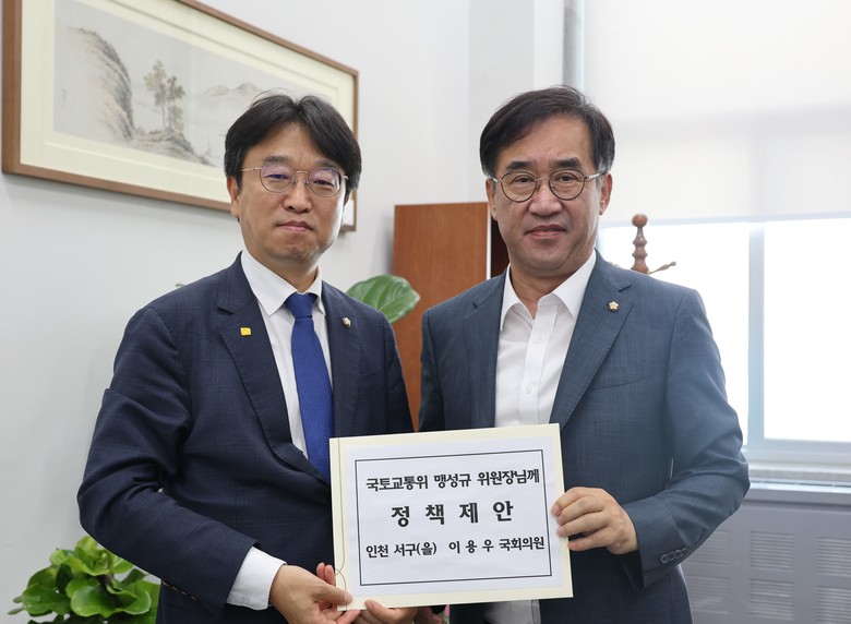 더불어민주당 인천 서구(을) 이용우 국회의원은 국회 국토교통위원회 맹성규 위원장에게 지역 현안 해결을 담은 정책제안서를 전달하고 국토교통위원회의 적극적인 지원과 협조를 요청했다고 밝혔다.