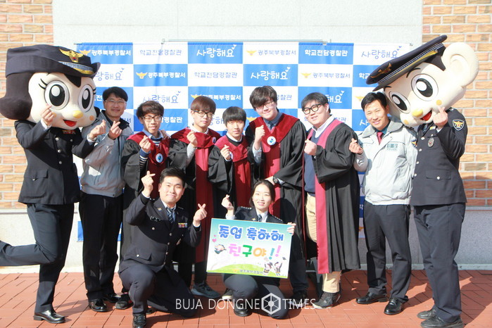 | △광주북구경찰서는 졸업식 기간을 맞아 '17. 1. 25(수)일부터 다음 달 17일(금)까지 24일간을 '강업적 졸업식 뒤풀이 및 학교폭력 예방활동 기간'으로 정하고 학교·학부모·NGO 등과 함께 예방·선도 활동에 나선다 |