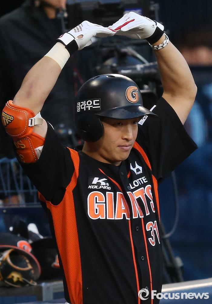 △ 9월17일 잠실구장에서 열린 2015 프로야구 롯데-두산 경기,롯데 손 아섭이 팔로 하트를 그리고 있다. 양지웅 기자 yangdoo@focus.kr |