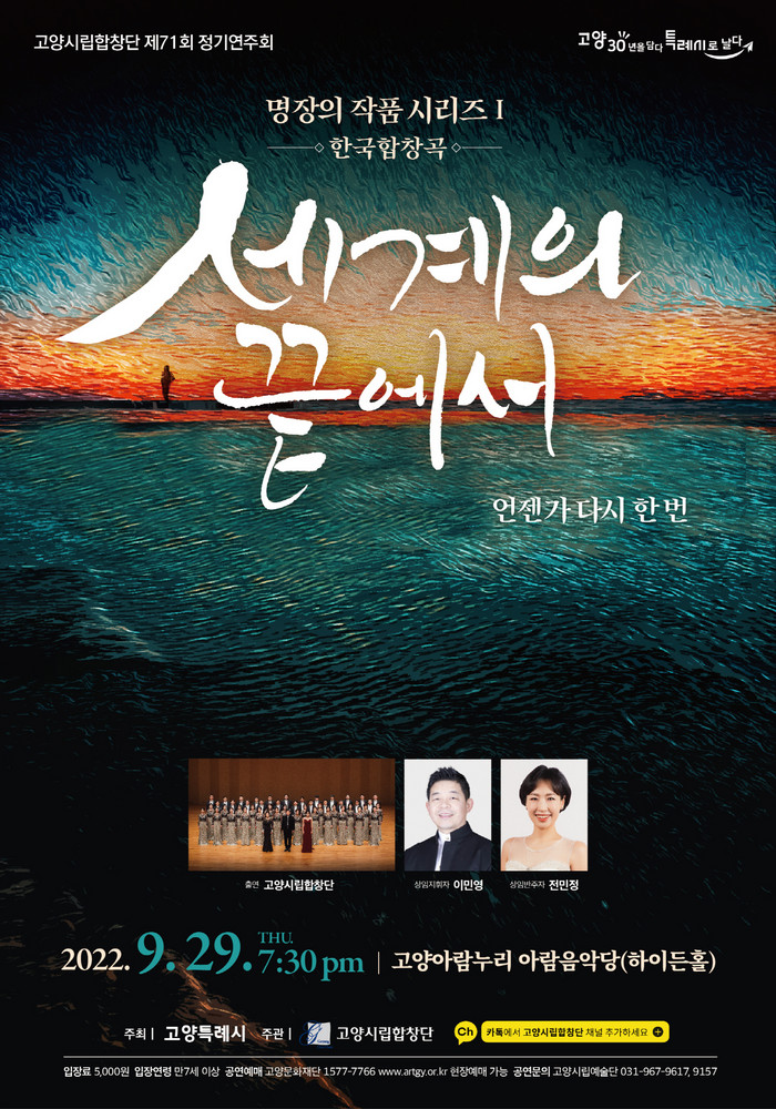 [부자동네타임즈 김인수기자] 깊어가는 가을의 정취가 물씬 느껴지는 9월의 마지막 주, 지친 마음을 달래고 영혼을 살찌우는 시간을 선사하기 위해 고양시립합창단이 제71회 정기연주회 <세계의 끝에서 – 언젠가 다시 한번>을 오는 9월 29일(목) 오후 7시 30분 고양아람누리 아람음악당(하이든홀)에서 개최한다.