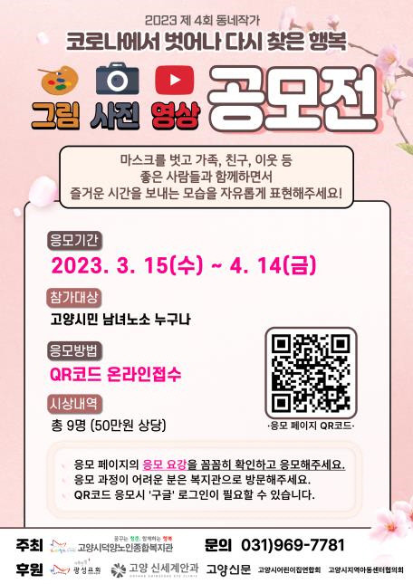 공모 부문은 그림, 사진, 영상 세 부문으로 고양시덕양노인종합복지관 홈페이지 공지사항과 카카오톡채널에 게시된 링크 또는 현수막, 전단 홍보물에 포함된 QR코드를 통해 응모할 수 있다.