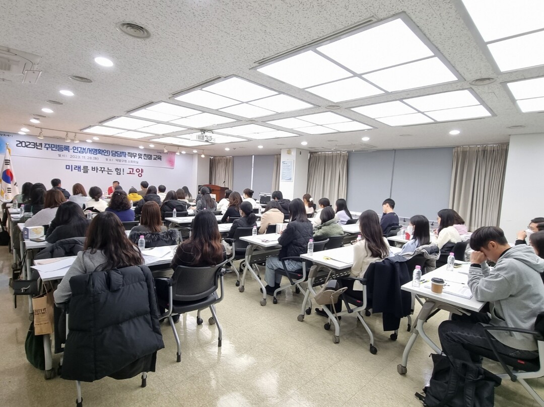 [부자동네타임즈 = 김인수 기자] 지난 11월 28일 덕양구청 소회의실에서 2023년 주민등록·인감(서명확인) 담당자를 대상으로 직무 및 친절교육을 실시했다.