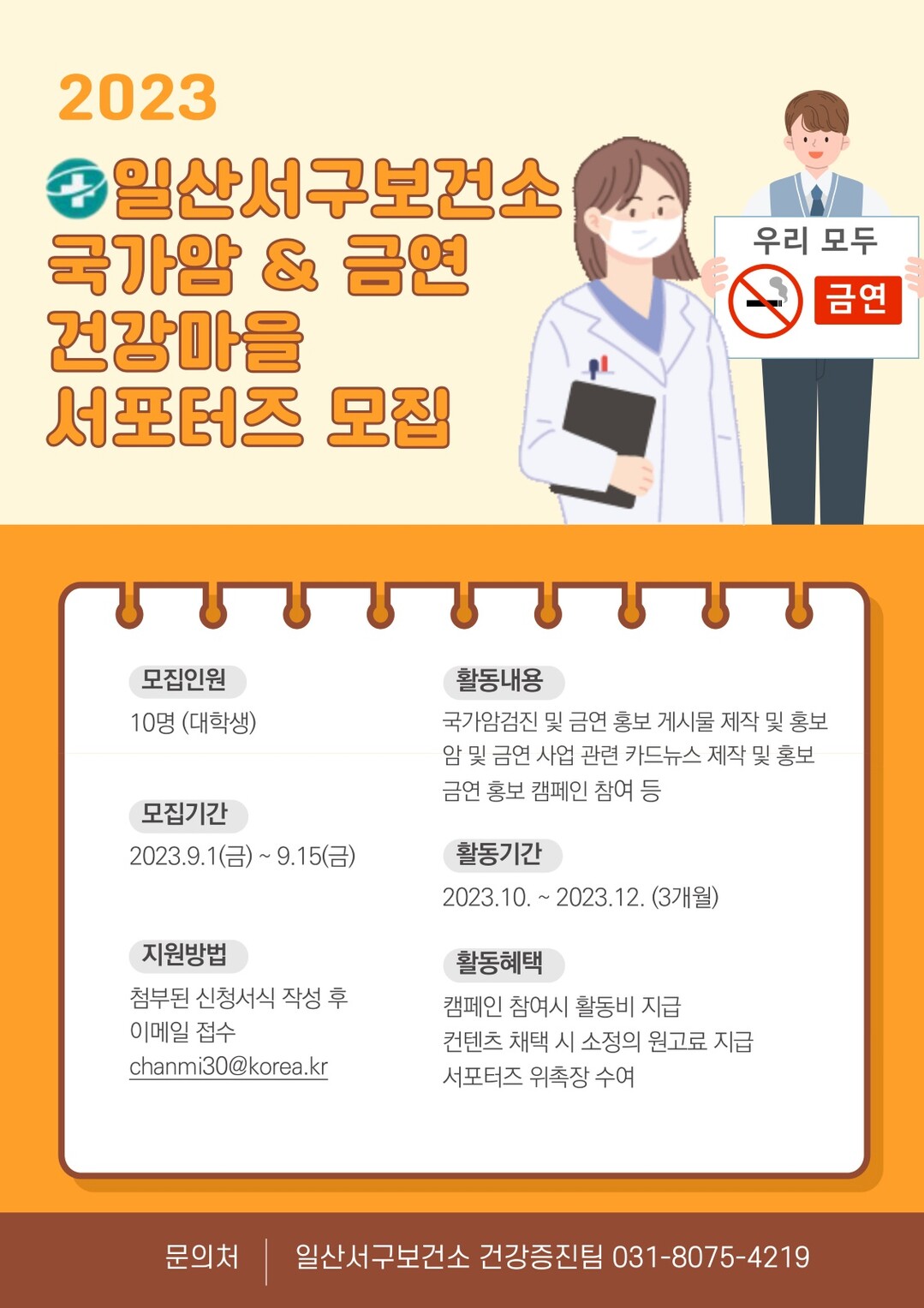 [부자동네타임즈 = 김인수 기자] 일산서구보건소는 대학생 10명을 ‘국가암·금연 건강마을 서포터즈’로 모집한다. 모집 기간은 9월 1일부터 9월 15일까지다.
