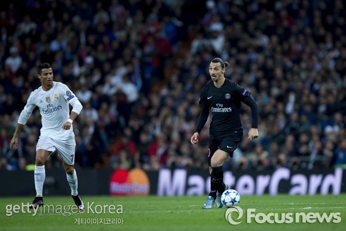 | △ <마드리드/스페인=게티/포커스뉴스> 14일 새벽(한국시간) 레알 마드리드의 홈구장 스페인 마드리드 산티아고 베르나베우에서 열린 레알 마드리드와 파리 생제르망(PSG)간의 챔피언스리그 조별라운드에서 레알의 크리스티아누 호날두(좌)와 PSG의 즐라탄 이브라히모비치(우)가 매치업을 이루고 있다. (C)게티이미지/멀티비츠 |