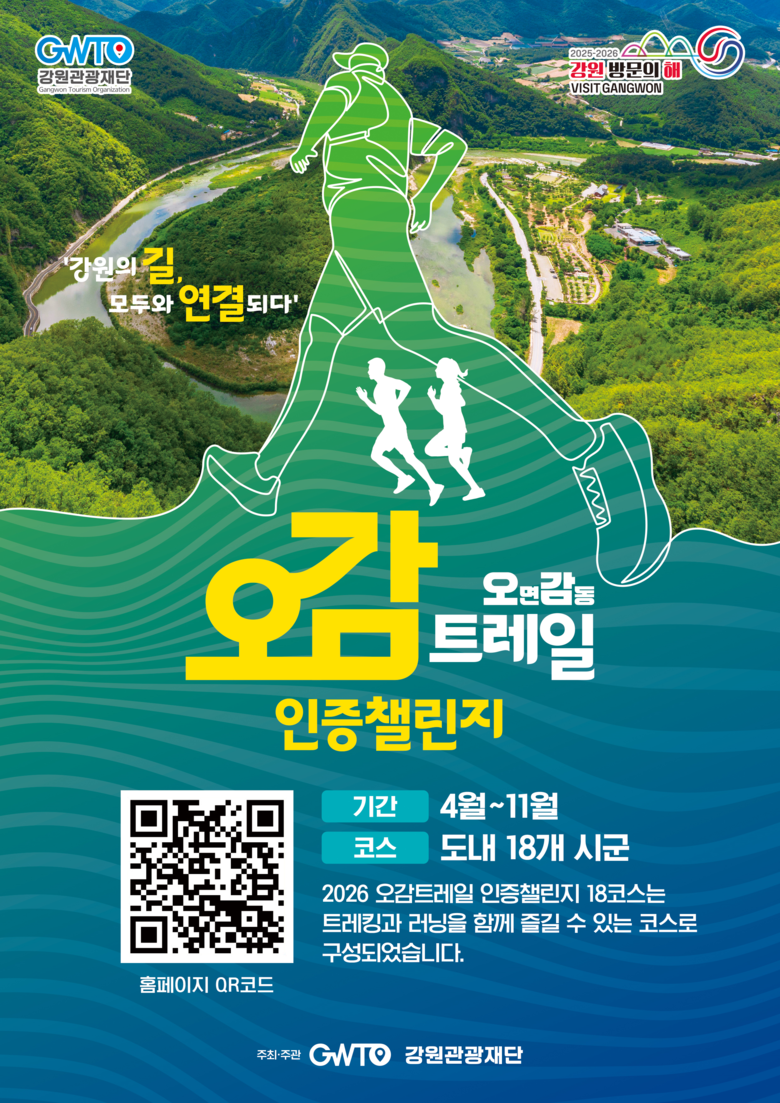 강원관광재단 최성현 대표이사는 “2025년 오감트레킹을 통해 걷기 관광에 대한 높은 수요를 확인한 만큼, 2026년에는 러닝과 트레일 요소를 결합한 ‘오감트레일’로 한 단계 도약하고자 한다”며, “보다 역동적이고 참여형 콘텐츠를 통해 강원을 대표하는 체험형 관광지로 발전시키겠다”고 밝혔다. 이어“앞으로도 변화하는 관광 트렌드에 발맞춰 차별화된 프로그램을 지속적으로 발굴하고, 관광객 유입과 지역경제 활성화가 함께 이루어지는 사업을 확대해 나가겠다”고 전했다.