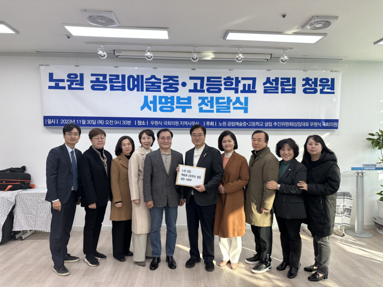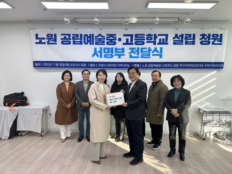 이에 우원식 의원은 노원 공립예술중·고등학교 설립을 요청하는 주민 서명운동을 10월 18일부터 11월 30일까지 진행했다. 서명운동에는 구립 청소년 교양악단과 합창단 자모회와 각 학교 학부모 단체 그리고 학부모 커뮤니티 ‘노원 맘스’, 노원구 학원연합회 소속 각 미술, 음악 교습소 등에서도 함께했다.