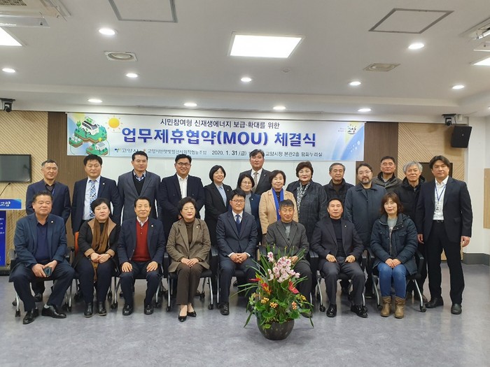 [부자동네타임즈 김인수기자] 고양시(시장 이재준)는 지난 31일 시청 평화누리실에서 한찬희 기후환경국장, 박평수 고양시민햇빛발전사회적협동조합 이사장, 조현숙 고양시의회 환경경제위원장 등 30여명이 참석한 가운데 시민참여형 신재생에너지 보급·확대를 위한 업무제휴협약(MOU)을 했다고 밝혔다.