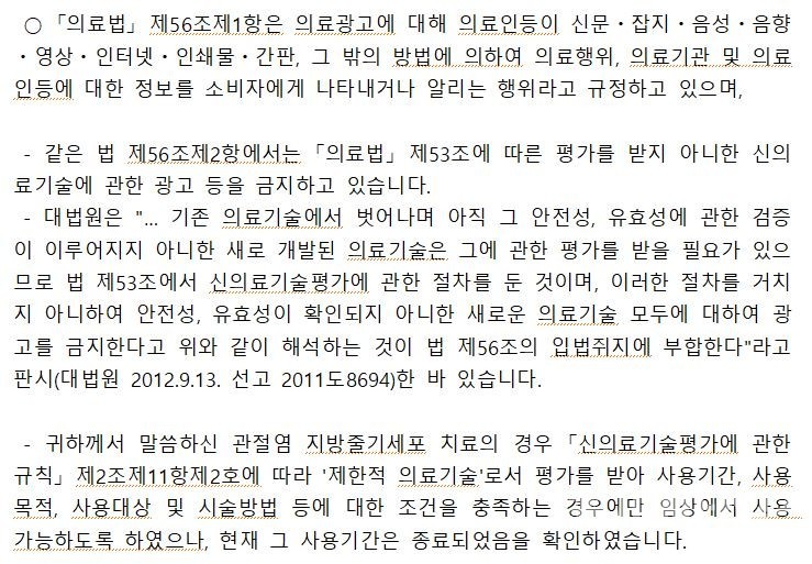 이에 대해 의료전문 법조인은 “광고 자체를 할 수 없는 제한적 의료기술을 광고한 것은 명백한 의료법 위반이고 정책의 주무 기관인 보건복지부도 의료법 위반에 해당되는 것으로 판단한 것에 대해 수사기관이 팔이 안으로 굽을 수밖에 없는 관련 민간 학회의 의견을 근거로 불송치 결정을 한 것은 납득하기 힘들다”라고 밝혔다.