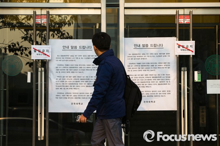 | △ 지난 5일 오전 폐쇄된 건국대학교 동물생명과학대 건물 앞으로 한 학생이 지나가고 있다. <사진제공=포커스뉴스> |