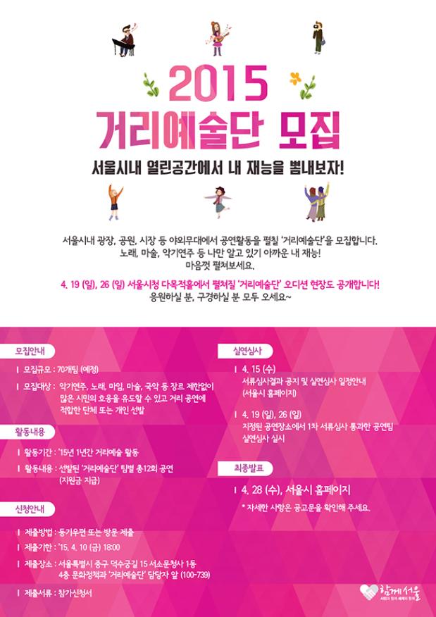 거리예술단은 1차 서류심사를 거쳐 19일(일), 26일(일) 서울시청 다목적홀(8층)에서 두 차례에 걸쳐 진행되는 공개오디션을 통해 최종 선정할 계획이다.