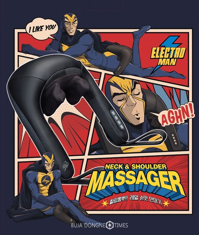 일렉트로맨 마사지기는 인체 공학적인 U자 형태로 목과 어깨를 감싸 동시에 마사지하는 기기로 실제 손마사지에 가까운 3D 입체손지압 형태로 구현했다.
