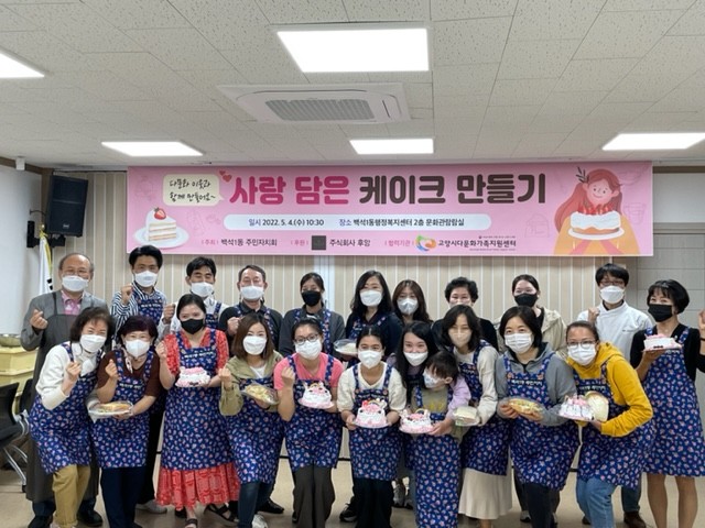 2부에서는 주민자치회 위원과 다문화가족 10팀이 함께하는 ‘사랑담은 케이크 만들기’가 진행됐다. ‘사랑담은 케이크 만들기’는 주식회사 후앙에서 만들기 재료 일체를 제공하고 셰프가 직접 케이크 만들기 과정에 대한 설명과 시연을 진행했다.
