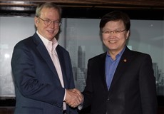 | △ 최양희 미래창조과학부 장관과 에릭 슈미트 구글ㆍ알파벳 회장이 30일 오전 서울 영등포구 63시티 한 식당에서 조찬 회동을 하고 있다. 2015.10.30 조종원 기자 choswat@focus.kr |
