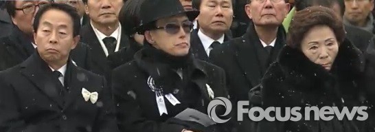 △ 고(故) 김영삼 전 대통령의 베일 속 큰 아들인 은철(59) 씨가 26일 국가장으로 열린 부친의 영결식에 전 영부 인이자 모친인 손명순 여사, 동생 현철 씨와 함께 참석했다. <사진출처=방송화면 캡처> |