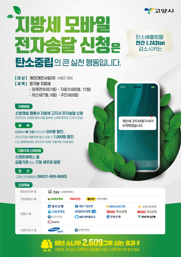 [부자동네타임즈 김인수기자] 고양시는 ‘지방세 모바일 전자송달 서비스’ 제도를 시민들에게 적극 홍보할 계획이다. 코로나19로 인해 비대면 서비스를 확대하고 기후위기 극복을 위한 탄소중립선언에 발맞추기 위해서다.