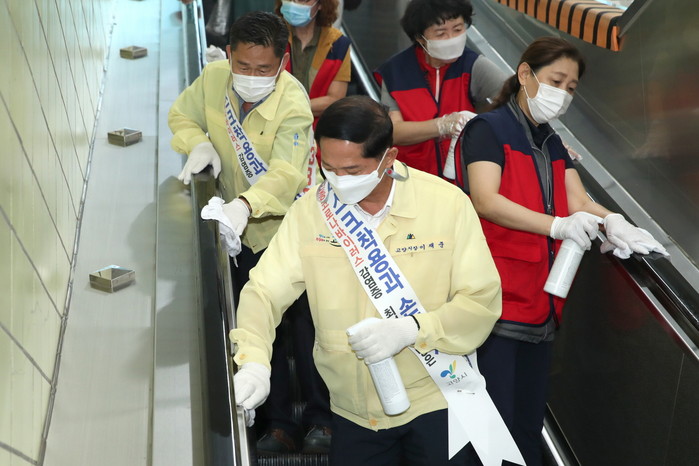 방역 참여자들은 고양시 39개 동 관할 버스정류장, 공원, 개방형화장실 등 다중이용시설 750곳에 대해 마스크를 착용하고 방역수칙을 준수하며 실시했다.