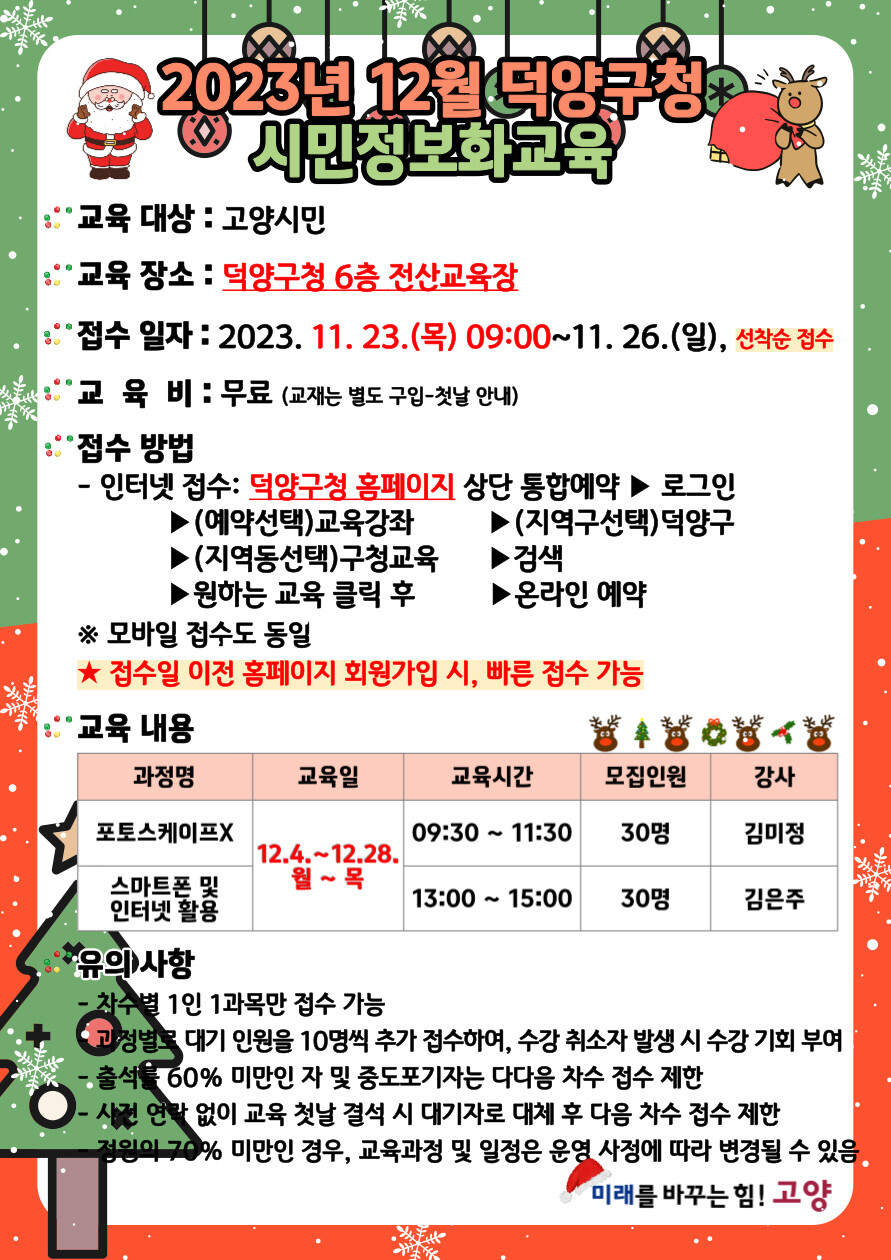 교육은 덕양구청 6층 전산교육장에서 진행된다. 접수는 덕양구청 누리집에서 온라인으로만 가능하다. 각 과정마다 선착순으로 30명을 모집하며, 덕양구청 누리집‘생활정보-교육-정보화교육’또는 상단의 ‘통합예약-교육.강좌-정보화교육’에서 신청할 수 있다.