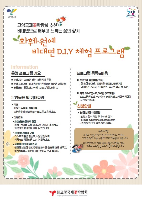 2021 비대면 화훼·원예 D.I.Y 체험 프로그램에 참여를 원하는 기관이나 단체는 고양국제꽃박람회 홈페이지를 통해 자세한 내용을 확인할 수 있다.