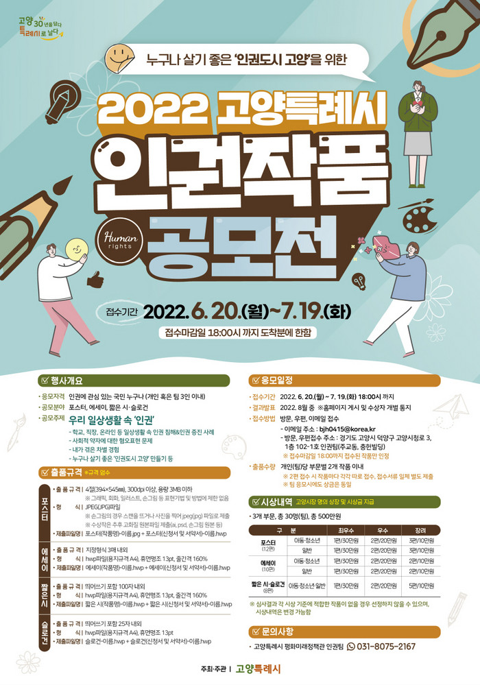 공모전 유의사항 및 세부내용은 고양시청 홈페이지에서 확인할 수 있다. 관련 문의는 고양시 평화미래정책관 인권팀으로 문의하면 된다.