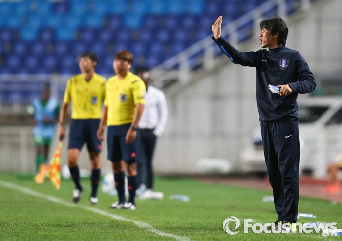 | △ 지난 9월 2일 오후 경기 수원시 팔달구 월드컵로 수원월드컵경기장에서 열린 '2015 수원 컨티넨탈컵 U-17 국제청소년축구대회' 대한민국과 나이지리아 경기에서 최진철 감독이 선수들에게 지시를 하고 있다. <사진제공=포커스뉴스> |