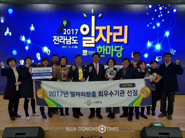 지난 21일, 한국전력 본사 비전홀에서 열린 ‘2017년 전라남도 일자리 한마당’ 행사에서 나주시는 일자리 사업 우수 시·군 평가 최우수기관으로 선정, 기관표창과 함께 시상금 1,300만 원을 수여받았다.