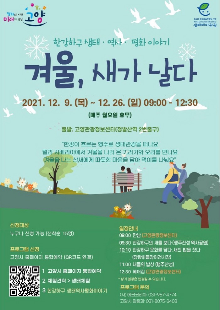 ‘겨울, 새가 날다’는 문화체육관광부 주관 대한민국 생태테마관광 10선에 선정된 적이 있는 고양시 생태관광 프로그램 ‘한강하구 평화이야기’의 겨울편이다. 시는 지난 6월부터 11월까지 가을편 ‘행주에서 대덕까지, 평화누리길을 걷다’을 운영해 높은 시민 만족도를 얻은 바 있다.