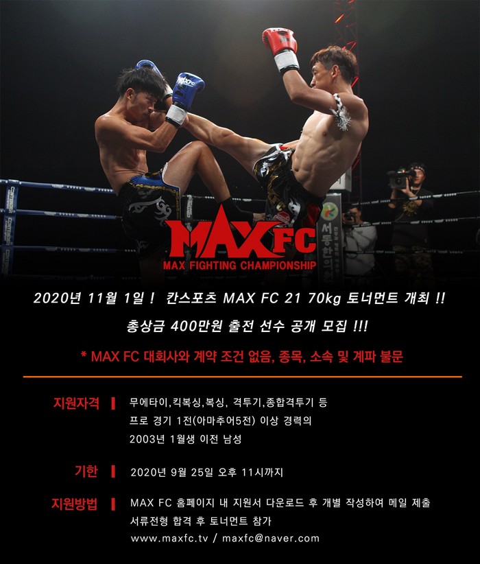 선발 방식은 서류전형으로 MAX FC 홈페이지(maxfc.tv)에서 양식을 다운받아 이메일 접수하면 된다. 총 4명을 선발하며 이들은 MAX FC 추천 선수 4인과 당일 우승자를 가리는 ‘원데이 8강 토너먼트’로 진행된다.