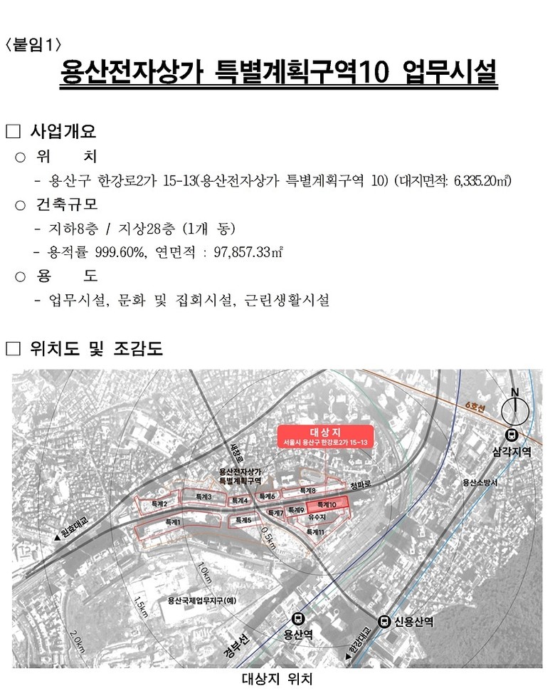 이번 건축심의를 통과한 대상지는 용산구 한강로2가 15-13번지 일대(대지면적 6,335.20㎡)다. 이곳에는 용적률 1,000%가 적용되어 지하 8층부터 지상 28층, 연면적 97,857㎡ 규모의 매머드급 복합건축물이 들어선다. 건축물의 주 용도는 미래 신산업 생태계 조성을 위한 업무시설(AI·ICT 등)이며, 저층부에는 시민과 입주민이 일상에서 문화생활을 영위할 수 있는 문화 및 집회시설(갤러리 등)과 근린생활시설이 함께 조성될 예정이다.