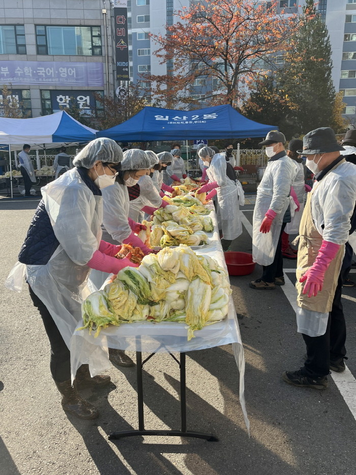 [부자동네타임즈 김인수기자] 고양시 일산서구 일산2동 행정복지센터는 지난 16, 17일 일산2동 새마을협의회주관으로 통장협의회, 주민자치회, 지역사회보장협의체, 어머니 자율방범대 등 직능단체 위원 40여명이 모여‘효사랑 김장나눔’행사를 진행했다.