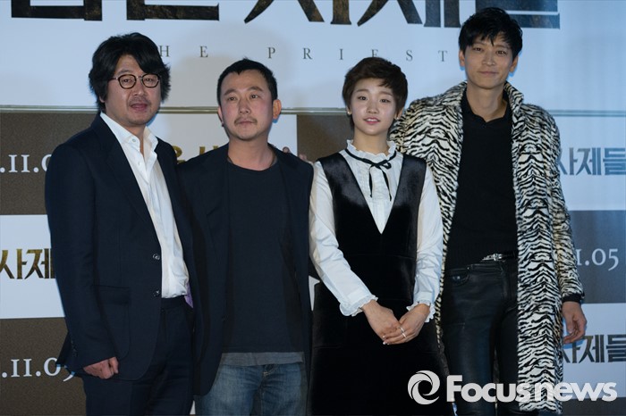 (서울=포커스뉴스) 28일 오후 서울 성동구 왕십리 광장로 왕십리CGV에서 열린 영화 '검은 사제들' 언론시사회에 참석한 배우 김윤석(왼쪽부터), 장재현(영화감독), 박소담, 강동원.
