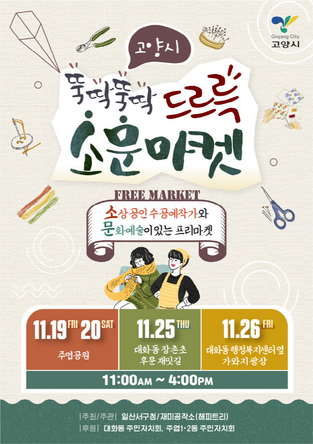 [부자동네타임즈 김인수기자] 고양시 일산서구(구청장 이재혁)가 수공예품과 버스킹 등 문화공연이 어우러진 뚝딱뚝딱~~ 드르륵 소문마켓을 개최한다. 소문마켓은 소상공인 수공예작가와 문화예술이 있는 프리마켓이라는 의미를 담고 있다.