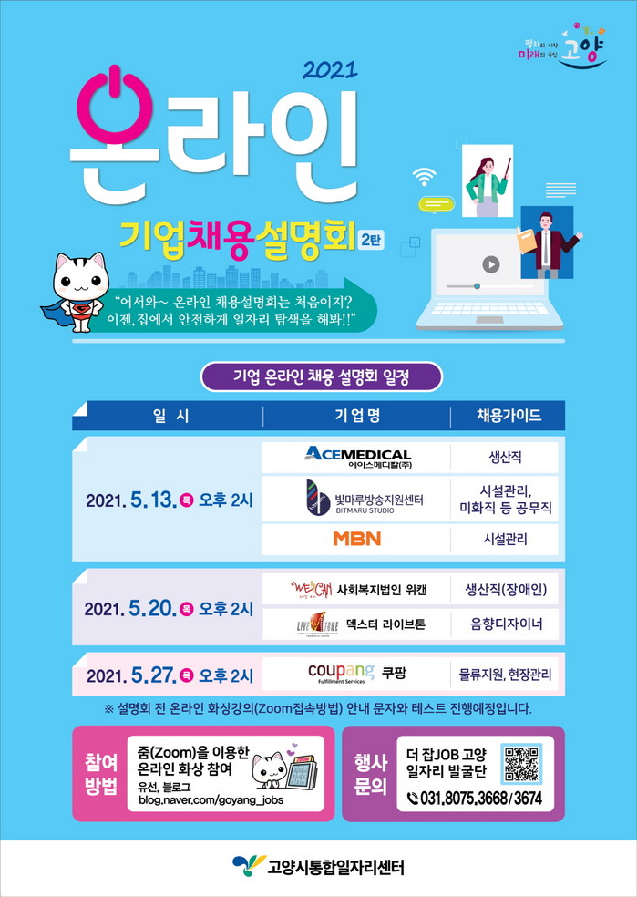 참여 방법은 채용설명회 전날까지 고양시통합일자리센터로 전화하거나 블로그에서 사전 신청하면 링크를 통해 접속할 수 있다. 온라인 화상 회의 사용법이 익숙하지 않은 시민들을 위해 사전에 로그인 테스트를 안내해준다.