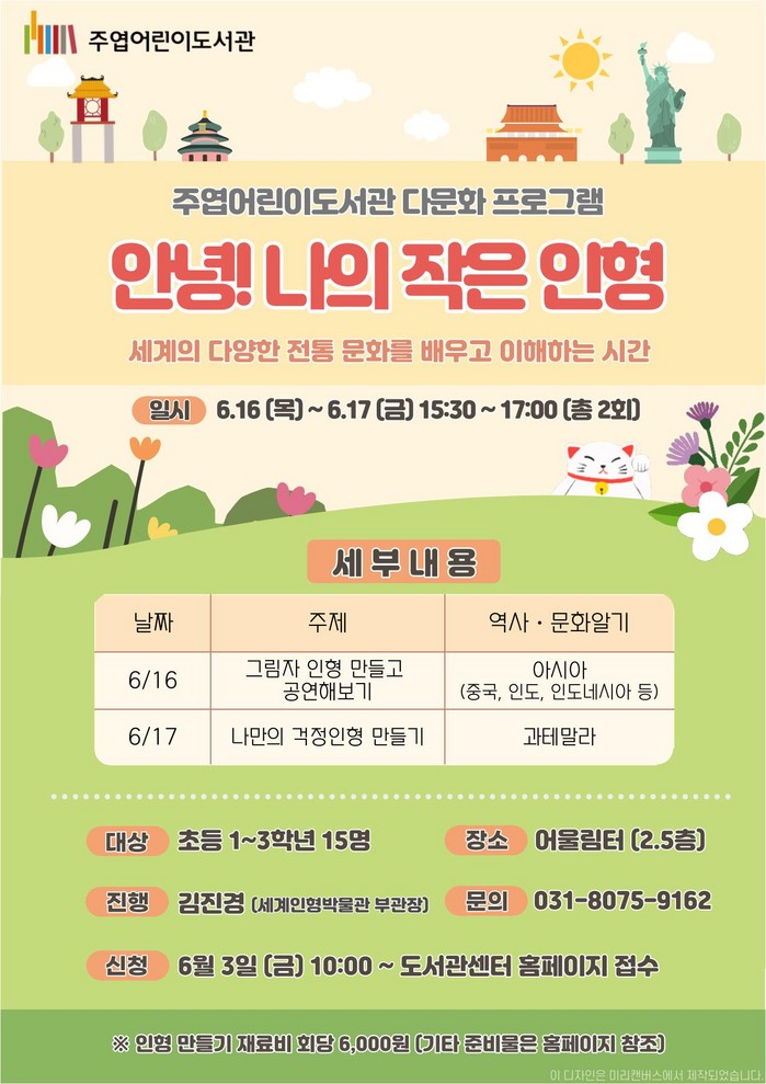 이번 프로그램은 다문화 이해를 돕는 세계 인형 만들기 체험 수업으로 김진경 세계인형박물관 부관장이 프로그램을 진행한다. 초등 1~3학년을 대상으로 6월 16일부터 17일까지 오후 3시 30분부터 5시까지 운영하며 주엽어린이도서관 어울림터에서 대면 수업으로 진행한다.