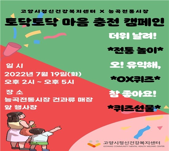 [부자동네타임즈 김인수기자] 고양특례시 정신건강복지센터가 19일(화) 오후 2시부터 5시까지 능곡전통시장에서 ‘토닥토닥 마음충전 캠페인’을 진행한다. 고양특례시(시장 이동환)는 정신건강 인식도 조사, 전통 놀이, OX퀴즈 등 다양한 이벤트를 실시할 예정이다.