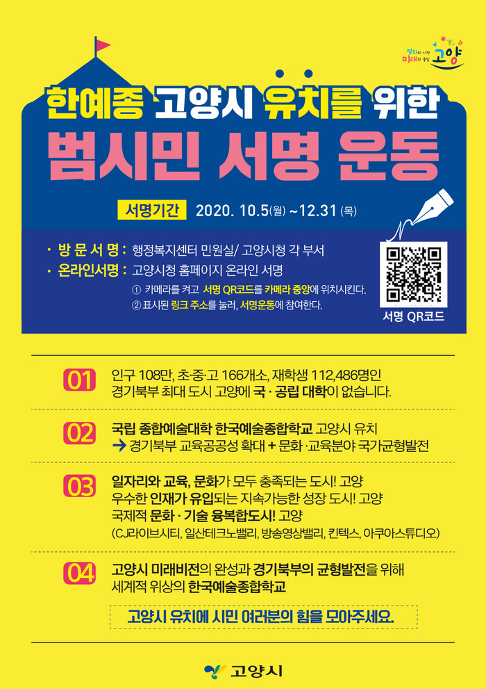 서명운동 참여는 방문 서명(각 행정복지센터 민원실 및 시청 각 부서) 혹은 온라인 서명(고양시청 홈페이지 또는 핸드폰 QR코드 스캔)으로 가능하다.