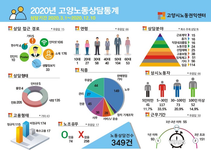 [부자동네타임즈 김인수기자] 2020년 2월 개소한 고양시노동권익센터(이하 ‘센터’라고 합니다)는 2020년 3월부터 12월까지 10개월간 총 349건의 노동상담을 진행했다.