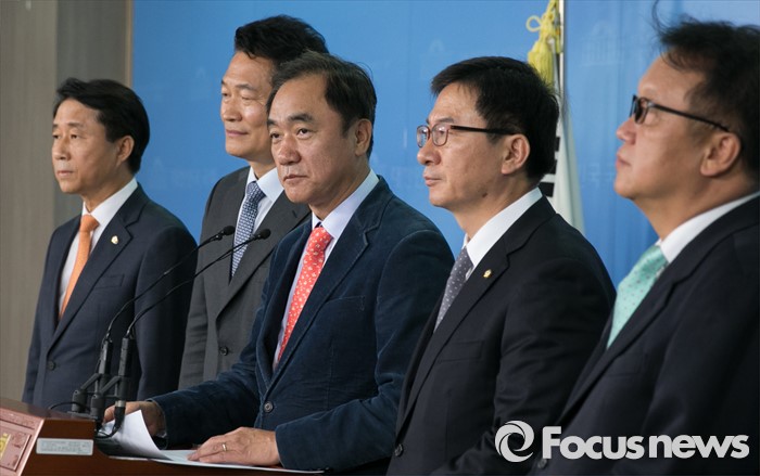 (서울=포커스뉴스) 16일 오후 서울 여의도 국회 정론관에서 새정치민주연합 중도모임 소속 '통합행동'이 기자회견을 열고 문재인 대표와 안철수 전 공동대표의 협력을 촉구하고 있다. 사진 왼쪽부터 조정식 의원, 송영길 전 인천시장, 정장선 전 의원, 정성호, 민병두 의원.