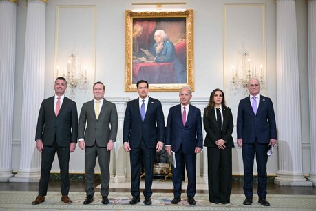 루비오 장관(왼쪽에서 세번째) 등 이스라엘-레바논 협상 참석자들