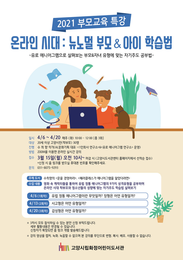 강의 신청은 3월 15일(월) 오전 10시부터 고양시도서관센터 홈페이지에서 수강생 30명을 선착순으로 모집한다. 20세 이상의 고양시민으로 학부모가 대상이다.