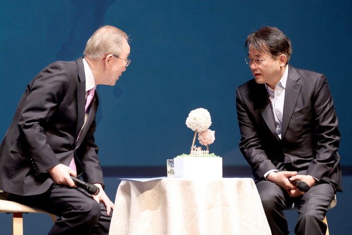 반 전 총장은 끝으로 “고3 때 만난 미국 존 F. 케네디 대통령이 ‘손을 내밀어서 남을 도와줄 수 있는 정신이 있느냐’고 말한 울림이 이제야 이해가 된다”면서 “우리 시민들은 세계시민의 정신을 가지고 도의적으로 전 세계적인 환경, 경제, 사회 등의 문제에 노력해야 한다”고 강조했다.