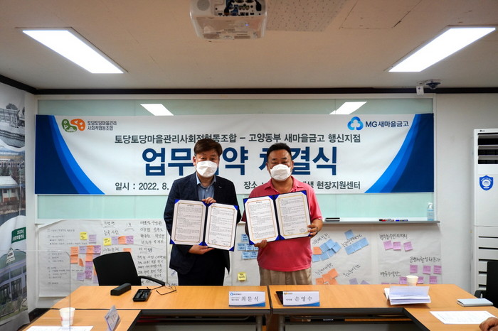 [부자동네타임즈 김인수기자] 고양특례시(시장 이동환)는 마을관리협동조합의 회계관리 지원을 위해 ‘토당토당 마을관리사회적협동조합’과 ‘고양동부 새마을금고 행신지점’이 업무협약을 체결했다고 12일 밝혔다.