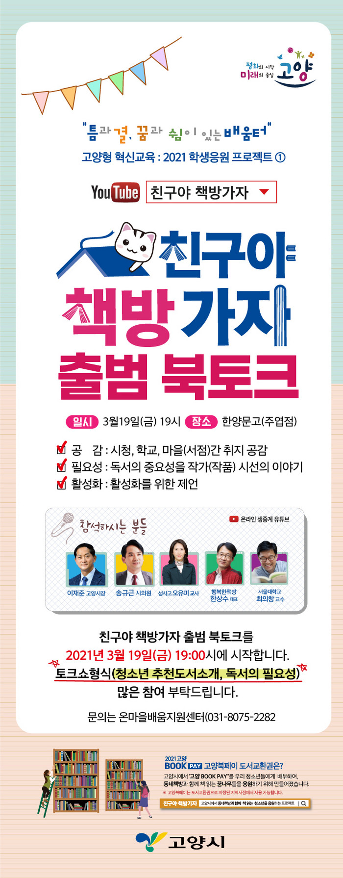시는 참여학교 및 서점 모집에 이어 학교를 통해 학생들에게 ‘고양 북페이’ 지급을 시작했으며, 이번 북토크 행사는 ‘친구야 책방가자’ 사업의 출범을 알리는 한편 그 취지를 널리 공유하고 독서하는 청소년들을 응원하고자 기획됐다.
