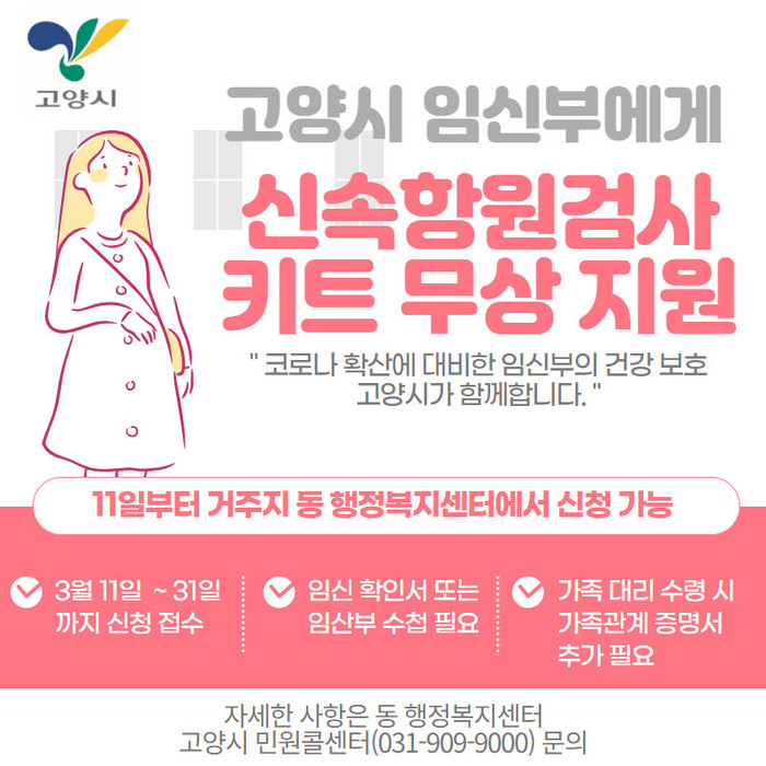 [부자동네타임즈 김인수기자] 고양시가 오는 11일(금)부터 동 행정복지센터를 통해 관내 임신부에게 신속항원검사키트를 무상으로 제공한다.