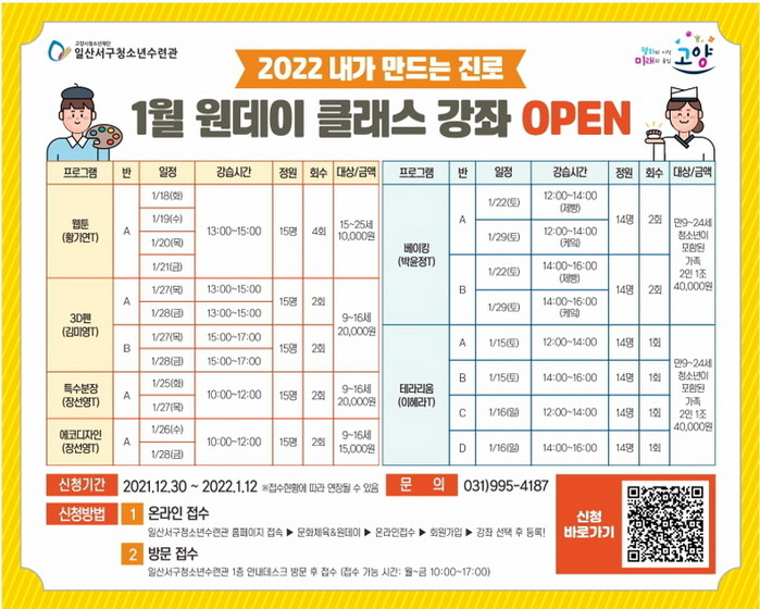 [부자동네타임즈 김인수기자] 고양시청소년재단(이사장 이재준) 일산서구청소년수련관에서는 2022년 1월 15일부터 29일까지 고양시 청소년과 청소년이 포함된 가족을 대상으로 원데이 클래스를 운영한다고 밝혔다.