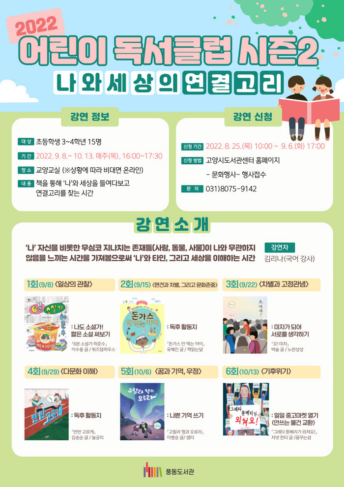 [부자동네타임즈 김인수기자] 고양특례시(이동환 시장) 풍동도서관이 오는 9월 8일(목)부터 10월 13일(목)까지 풍동도서관 교양교실에서 초등학생 3~4학년을 대상으로 어린이 독서클럽 시즌2를 진행한다.