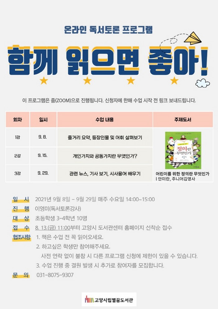 [부자동네타임즈 김인수기자] 고양시 별꿈도서관은 초등 3~4학년과 5~6학년을 대상으로 오는 9월부터 11월까지 총 9주간‘함께 읽으면 좋아!’독서토론 프로그램을 운영한다.
