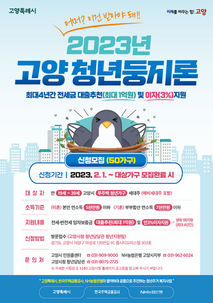 [부자동네타임즈 김인수기자] 고양특례시(시장 이동환)가 2월 1일부터 2023년 ‘고양 청년둥지론’ 사업의 지원가구 50가구에 대한 신청자 모집을 진행한다.