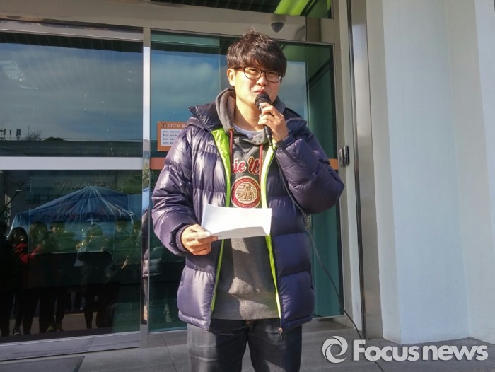 | △ 4일 낮 12시 30분 동국대학교 농성장 앞에서 열린 기자회견에서 최창훈 일반대학원 총학생회장이 발표하고 있다. <사진제공=포커스뉴스> |