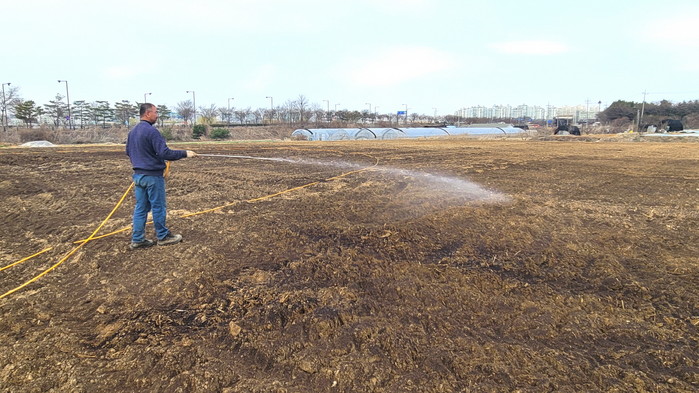 [사진설명] 경작지에 농업용 유용미생물을 뿌리는 모습.